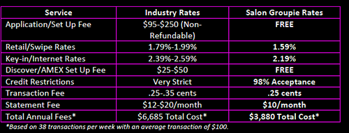 Groupie Salons have the advantage of reliable, super low-cost merchant accounts less the hassles of start-up fees or lengthy contracts. As a matter of fact, we will guarantee that we can beat your current rate, no matter how great you think it may be, and if we can’t, we will send you $500!